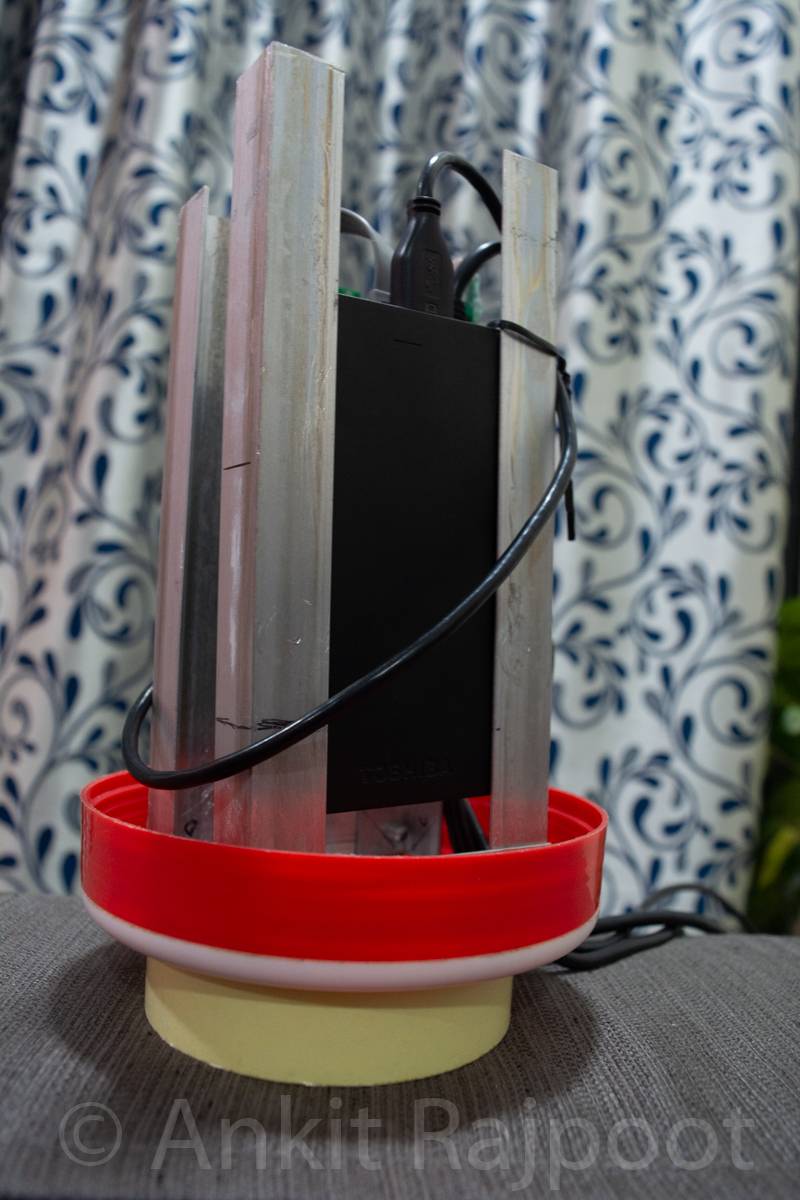 As you can see in the pictures above, the fan is missing because it’s on its way from China. I will update this post with new pics once I have that installed. But, before that, I would have to figure out whether to use it as an intake or exhaust. In any case, I would have to make some holes at the top of the outer shell. Also, the cable situation needs improvement. There are 3 cables coming out of the base right now. I want to keep it to a maximum of two: one for power and one for LAN. I am also exploring the possibility of fixing female LAN and micro USB connectors to the base. The base also needs some decent legs.