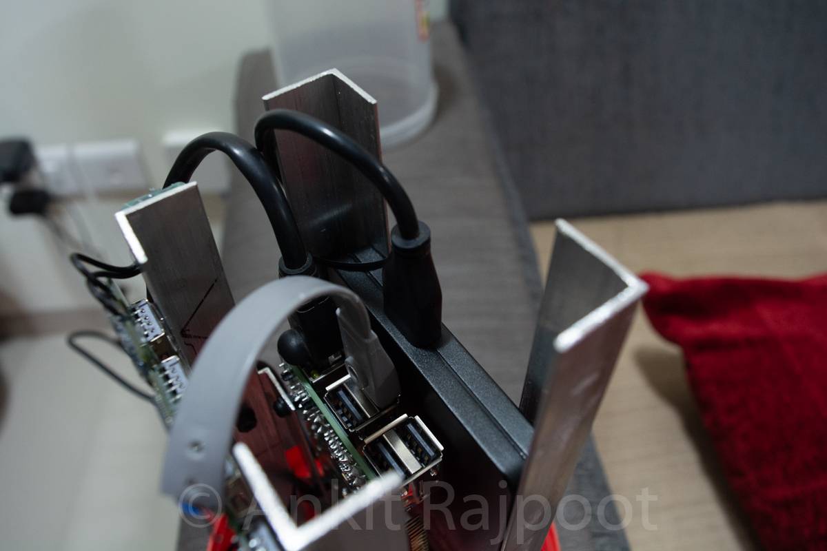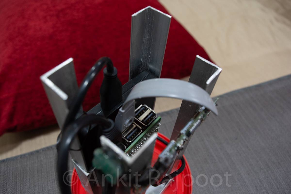 I mounted the USB hub on the back of the large aluminum bars using some hot glue. I am using a cheap non-powered USB hub which I modded to add external power to it. There is an excellent instructable by “msaleiro” that demonstrates how it can be done. The whole aluminum frame is fixed to the base using just two M4 screws. With everything mounted, it was time to connect the cables and route them nicely. Right now, there are three cables running out of a hole I drilled in the base: A CAT-6 LAN cable, and two USB cables. One USB cable powers the Raspberry Pi and the other powers the USB hub.